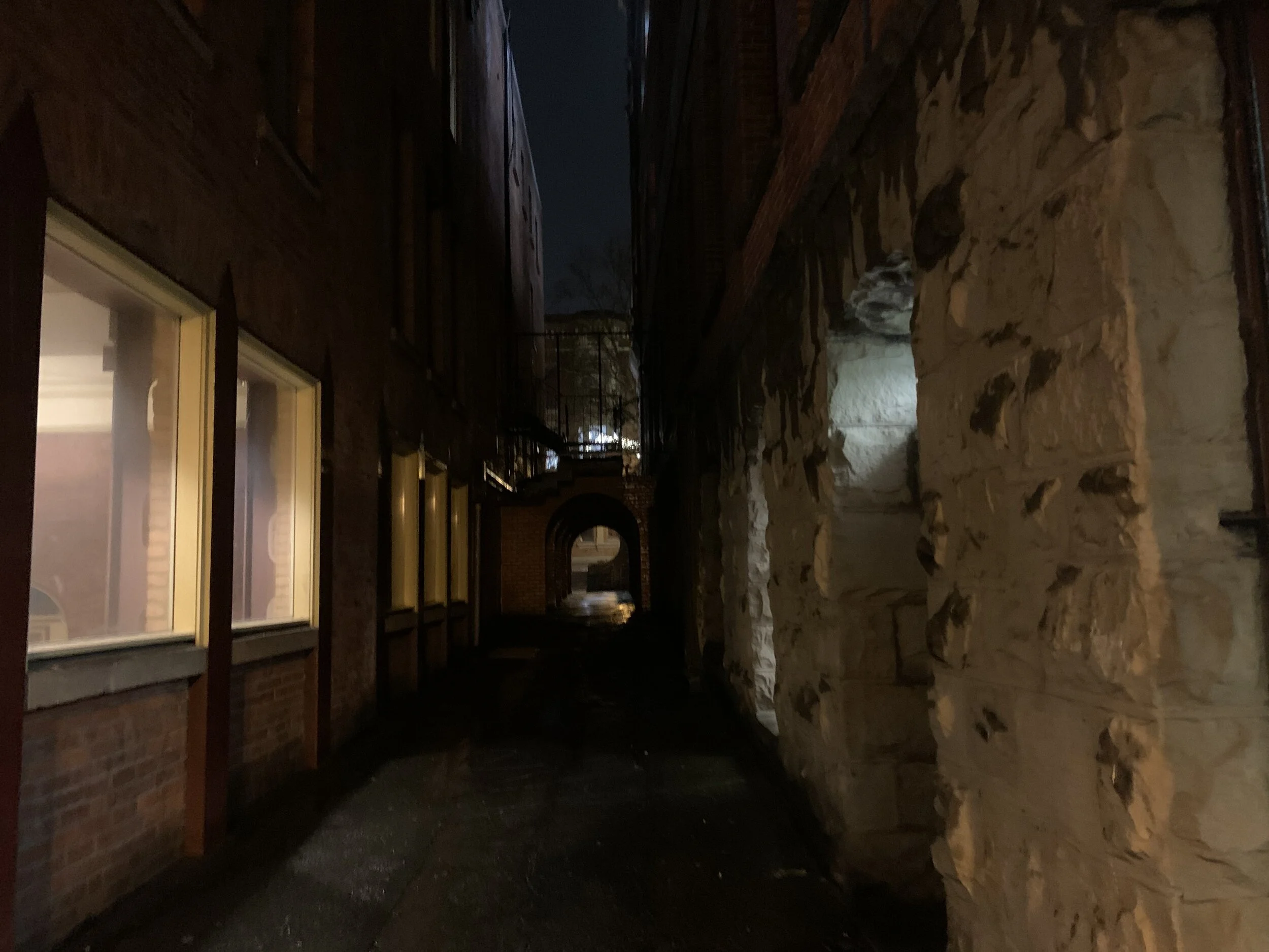 It poured rain, obscuring any sound as subtle as rattling chains. I turned on the camera on my cellphone as we walked through the alley. On the way out, video captured a small light dancing in the rain. Look to the lower left of the screen at the 30-second mark.